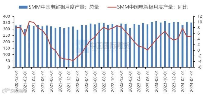 海外方面, 据SMM统计,2024年4月海外电解铝总产量为245万吨,同比上涨约1.1%。4月海外电解铝平均产能利用率约为87.5%,环比略增0.4%,同比上涨1.3%。2024年1至4月海外电解铝累计产量986.3万吨,同比上涨1.2%。