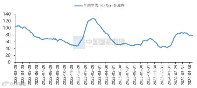 目前国内铝锭整体延续了自4月中旬以来的去库趋势。行业铝水比例偏高,铸锭总量同环比下滑一定程度削弱了铝锭的库存压力;同时铝厂库存压力宽松,发货节奏整体放慢,也使得五一假期期间以及节后到货偏少。截至5月13日,电解铝锭社会总库存为77.82万吨,较一周前减少1.63万吨,同比增加3.82万吨,仍处于近七年同期低位。后期在刚需支撑的背景下,预计电解铝锭库存整体将呈现稳中小降的趋势。