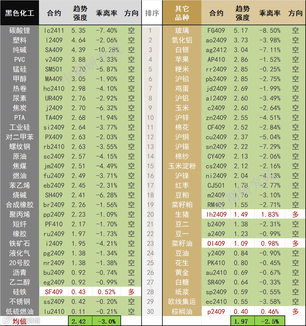 中期商品趋势榜 | 碳酸锂、玻璃、塑料、纯碱、PVC、氧化铝空头强势(0729)