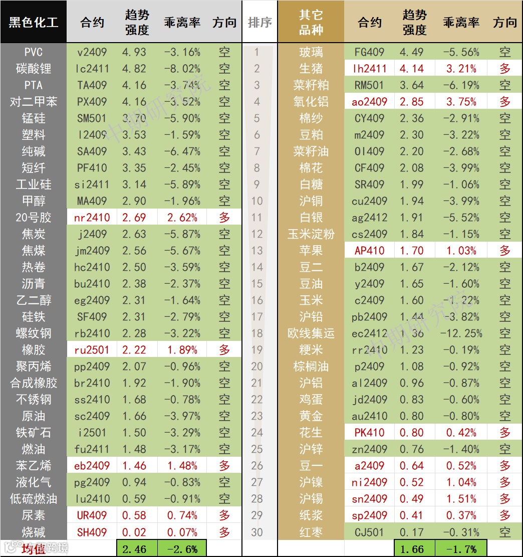 中期商品趋势榜 | PVC、碳酸锂、玻璃、PTA空头持续 生猪多头强势(0809)