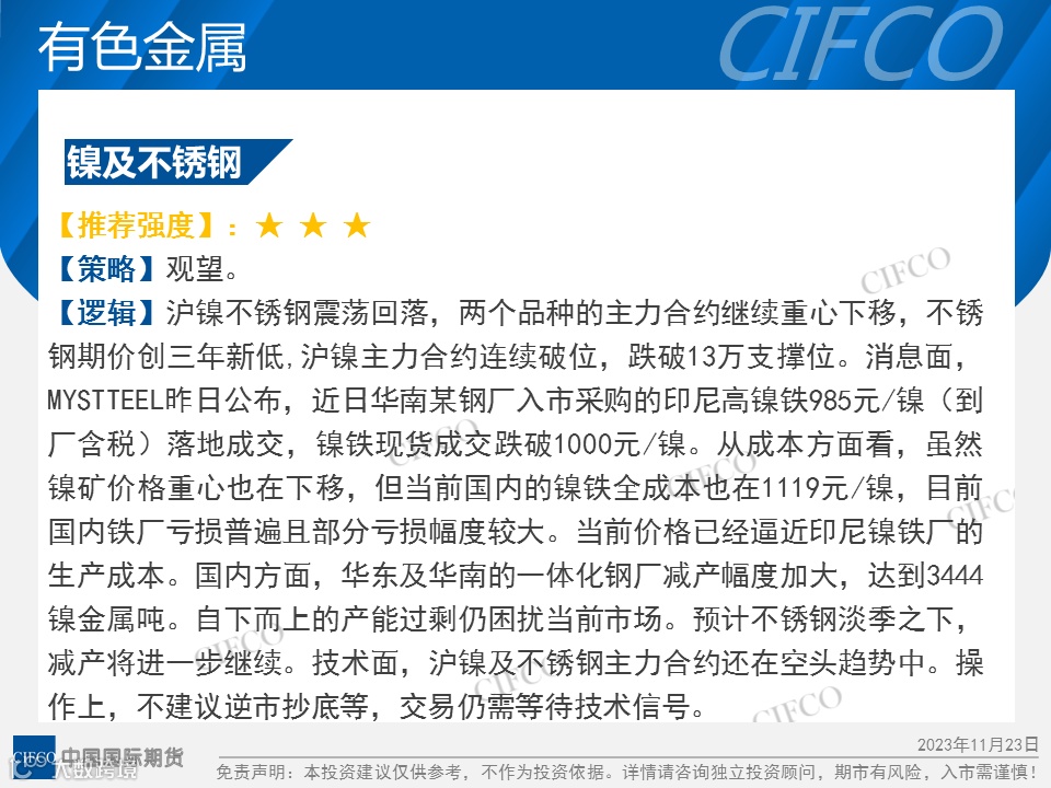 中期早知道 | 沪镍持续下跌  塑料小幅下跌 中国国际期货福建分公司
