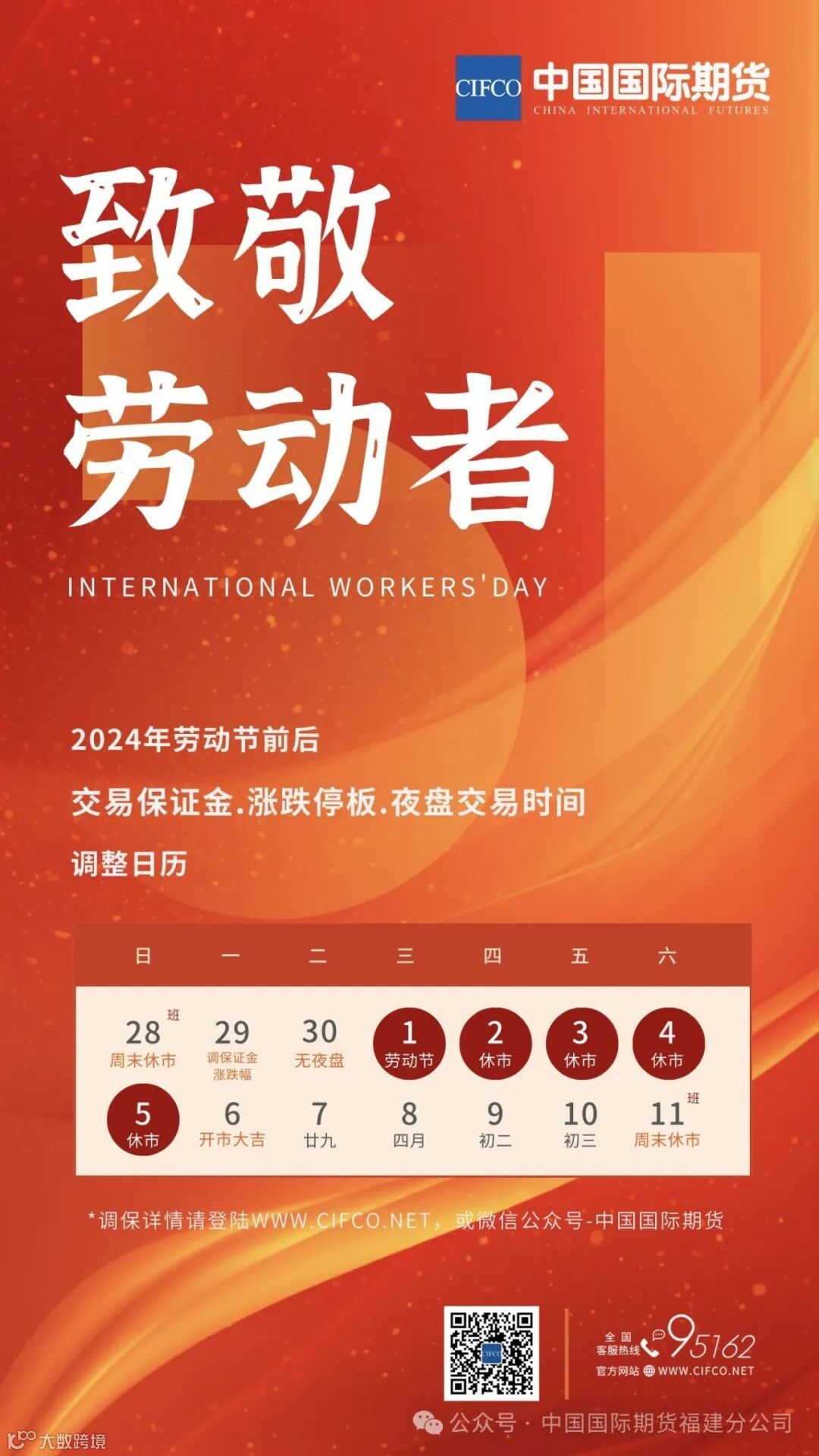 2024年劳动节临近,期货市场休市时间为2024年5月1日—5月5日,5月6日恢复交易。 · 4月30日(星期二)晚上不进行夜盘交易。 · 5月6日(星期一)所有合约集合竞价时间为上午08:55-09:00。 · 5月6日(星期一)当晚恢复夜盘交易。 请各位客户调整好帐户持仓,合理分配资金,注意控制风险!