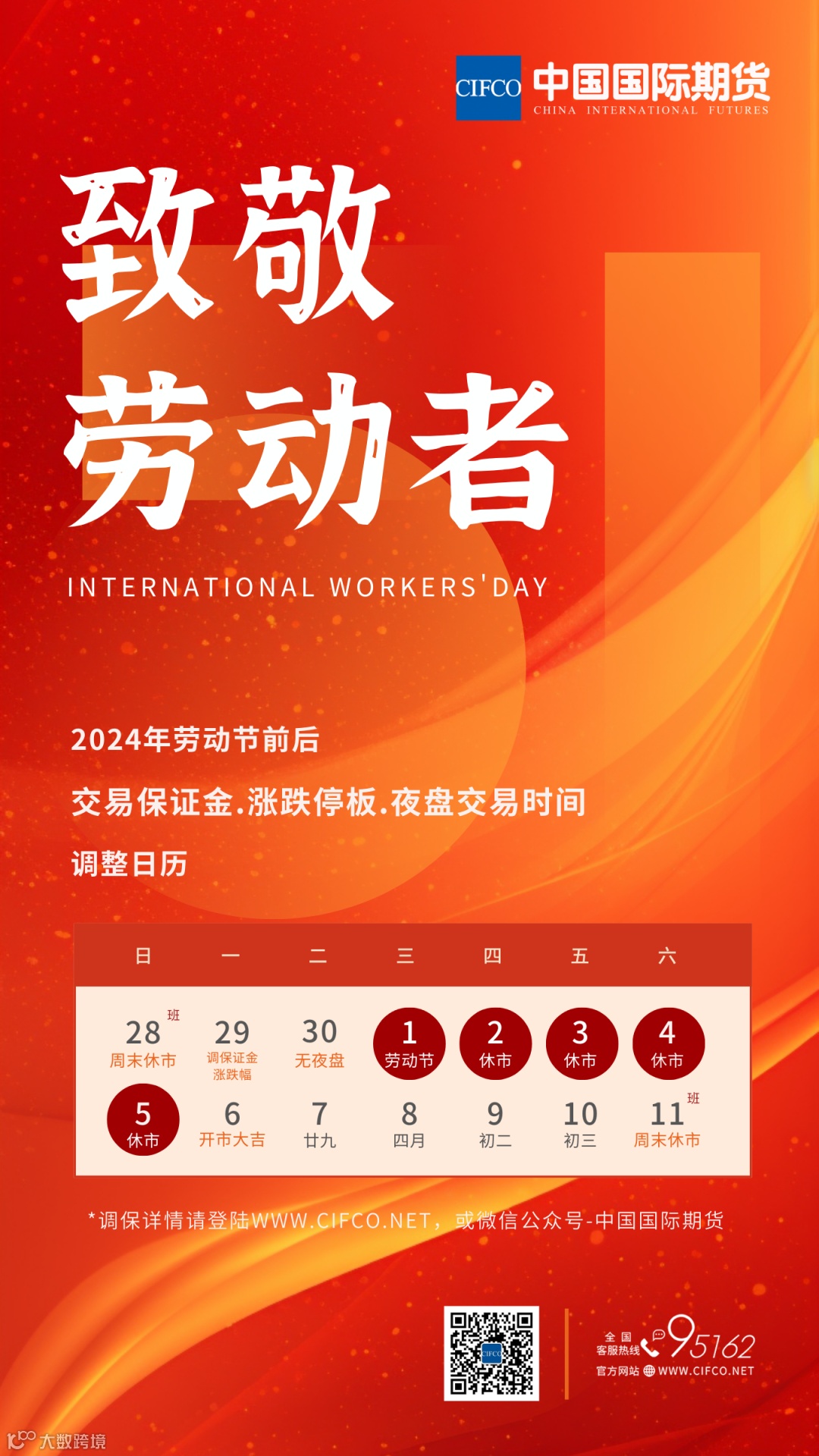 2024年劳动节临近,期货市场休市时间为2024年5月1日—5月5日,5月6日恢复交易。根据交易所调整交易保证金的相关规定,我公司劳动节期间各品种的交易保证金标准和交易所涨跌停板调整如下: