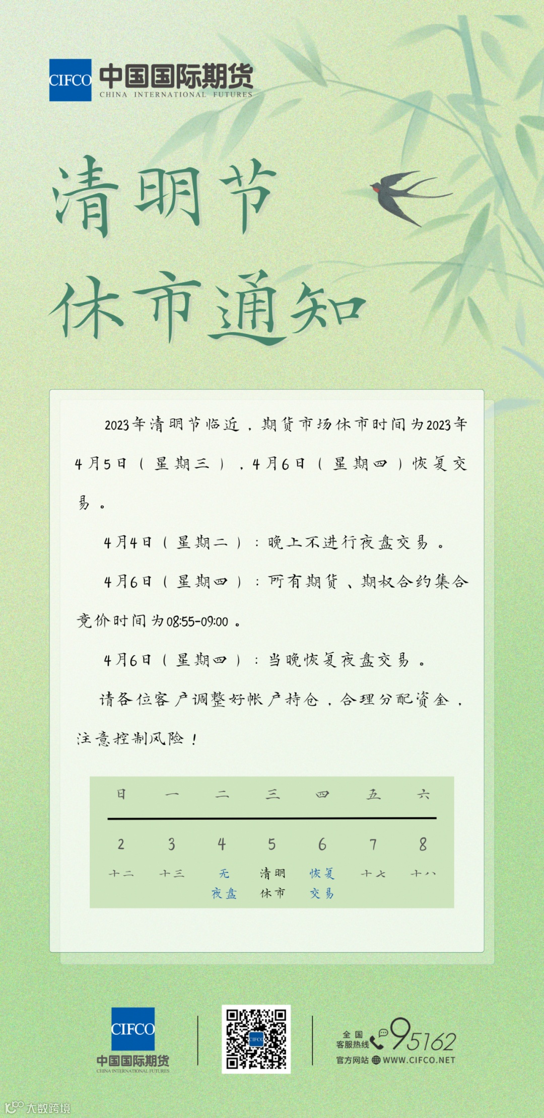2023年清明节临近,期货市场休市时间为2023年4月5日(星期三),4月6日(星期四)恢复交易。