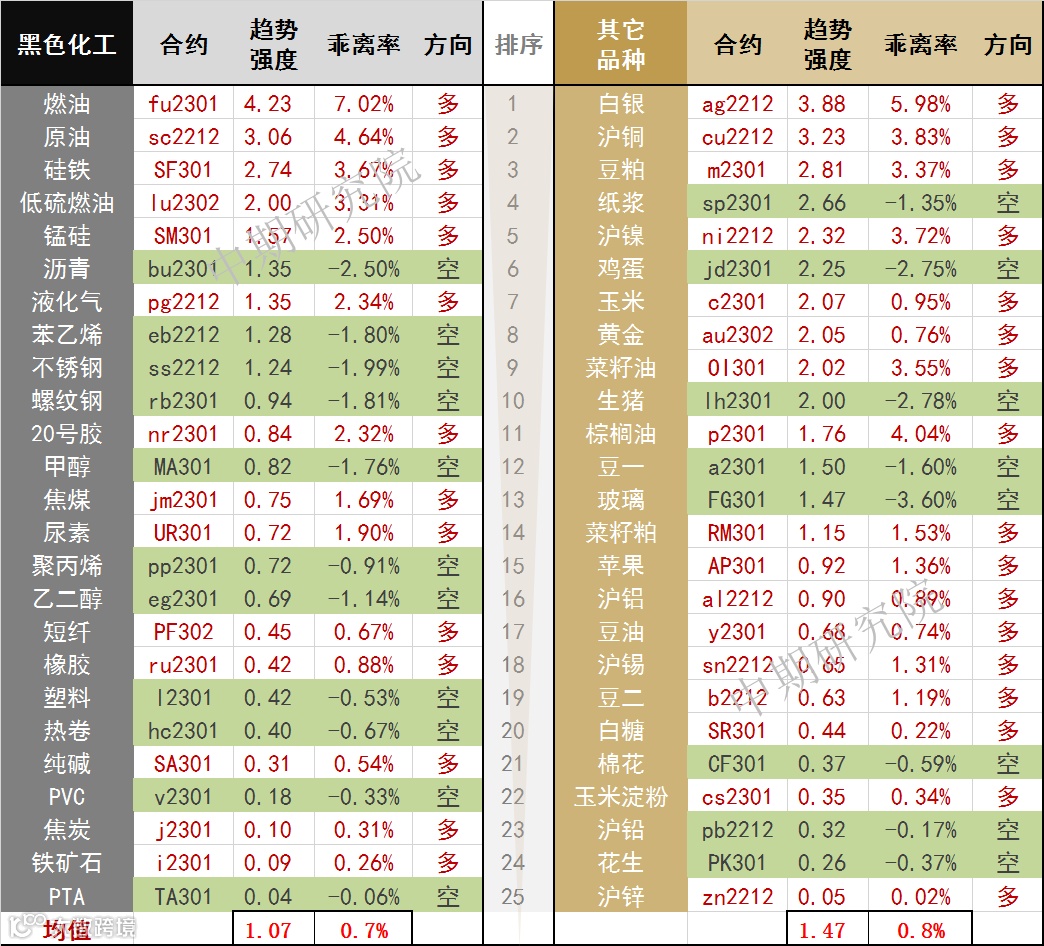 中期商品趋势榜 | 白银多头排名居首(1107)