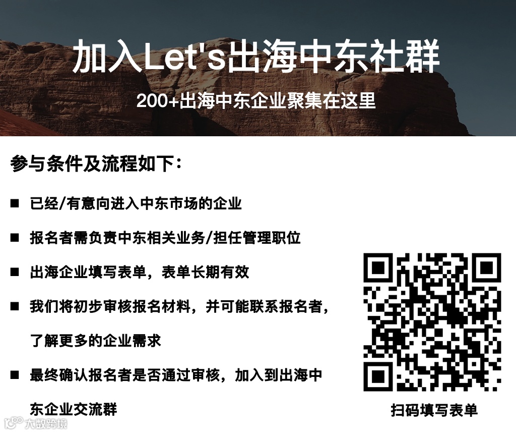 36氪出海持续关注中东市场机遇,于今年6月推出“出海中东社群”,组织出海中东系列讲座,帮助企业了解出海中东相关信息并创建开放的交流平台。我们诚挚邀请对中东市场感兴趣的出海企业加入社群,在未来参与交流活动并与我们互动。欢迎扫描下方二维码或点击文末“阅读原文”,填写表单申请加入。