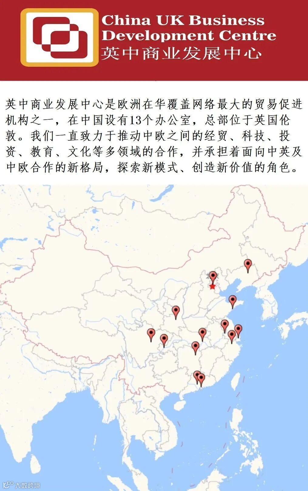 英中商业发展中心(CUKBDC)是总部位于英国伦敦的致力于中英两国之间双向科创、经贸、投资和文化教育交流合作的机构。转型自原英国贸易投资促进机构的在华地方网络,在应对全球经济和供应链重塑大势和挑战的背景下,为企业重新探索全球合作和扩张而设立。英中商业发展中心在中国建立了13间办公室,覆盖中国经济活跃地区,为新的国际合作局面下中英经贸投资的双向合作探索和创造新的模式与平台。英中商业发展中心已服务于数十家英、中企业达成合作和项目落地,亦与众多中国城市、区域、经济区签订了对外合作和招引合同,协助双方地方政府、贸促机构、行业和产业进行对外推广和合作。英中商业发展中心也通过其在欧盟的合作伙伴网络参与和支持中国与欧盟其他国家地区进行合作。英中商业发展中心是迪拜官方授权合作伙伴,代表迪拜政府机构为企业出海提供支持,并利用英中商业发展中心多层次资源组建迪拜生态,为中国各种业态和规模的企业拓展中东市场提供多种选择,形成中国-迪拜-英国(欧洲)三角互动市场机会。