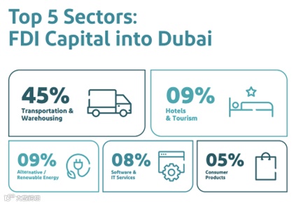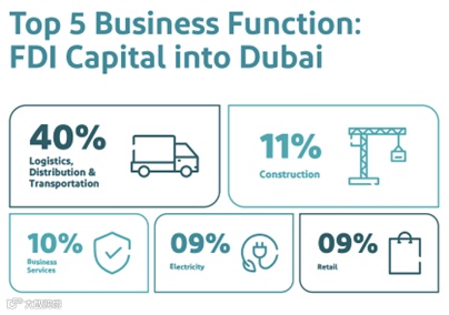 全球投资者资本入驻的前五大商业类目分别是:物流、配送和运输类,在并购活动的推动下占总资本投资的 40%;其次是建筑类11%,主要来源于迪拜的酒店行业发展;商业服务(10%);电力占9%,归功于迪拜可再生能源项目的投入;零售占9%,主要是食品和饮料、纺织品和消费品项目。以上五类的投资额占 FDI 资本投资总额的 79%。