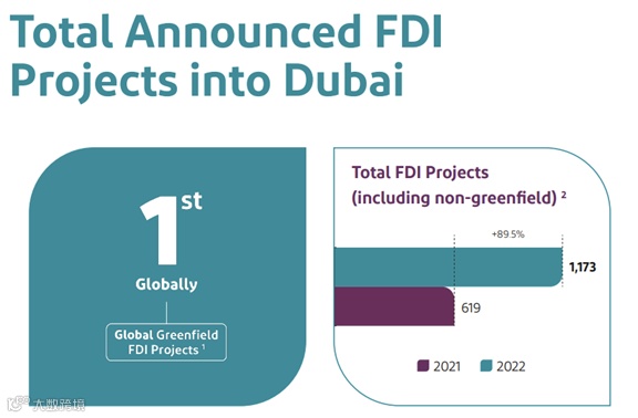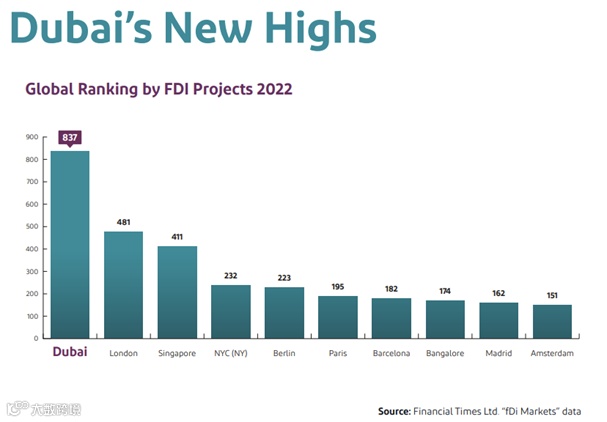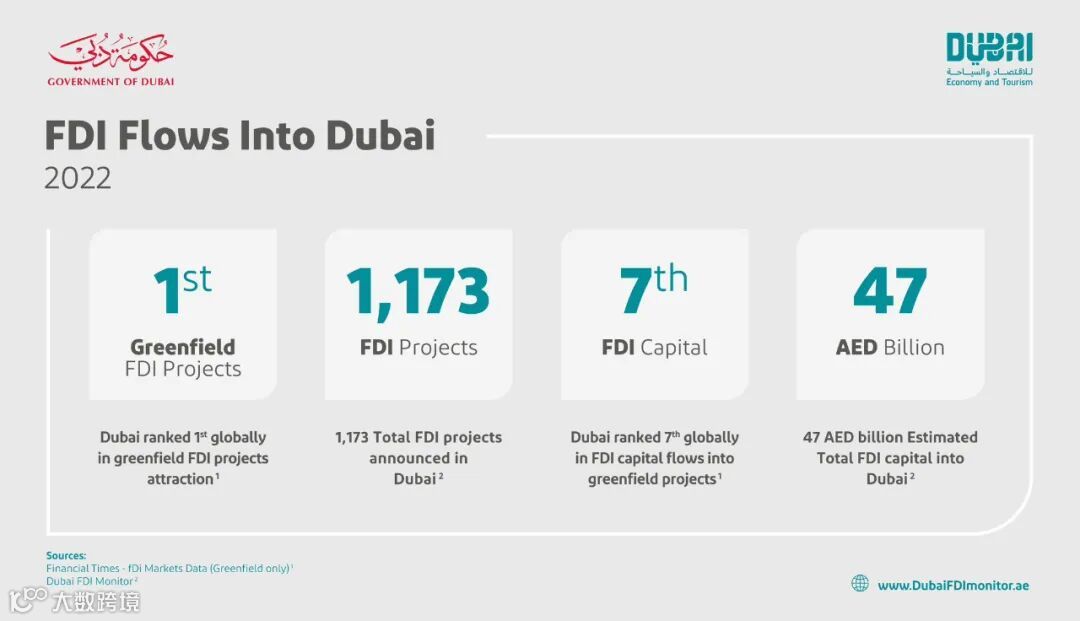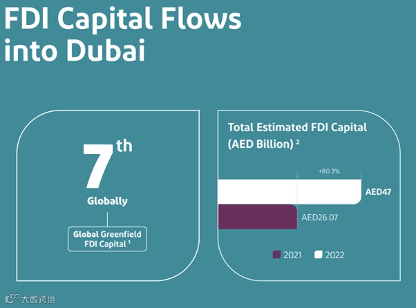 2022年,约有470 亿迪拉姆 (128 亿美元) 的 FDI 资本流入迪拜,与2021年相比增长80.3% ,和FDI项目增长的速度几乎保持一致,迪拜在全球吸引FDI资本城市中位列第七。