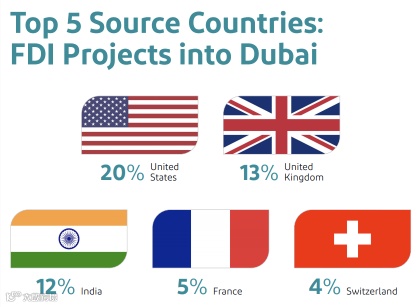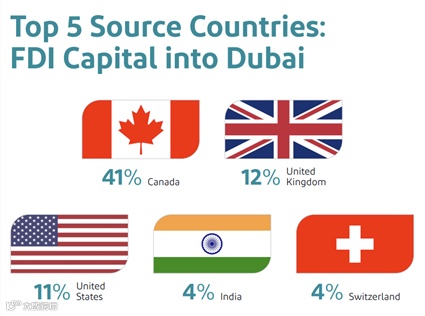 Dubai FDI Monitor显示,加拿大是迪拜FDI资本的最大投资者,占总数的41%,其次是英国(12%)和美国(11%),印度(4%)和瑞士(4%)分列第四和第五位。以上五国投资金额数占迪拜FDI总资本的72%。美国、英国和印度继续位FDI资本的主要来源国之列。