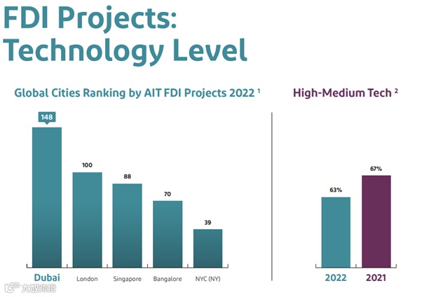 2022年,迪拜在吸引先进技术(AIT)项目的全球的份额增至5.5%,领先全球所有城市,排名第一,共有148个先进技术的绿地项目流入迪拜,相比去年的翻倍增长。