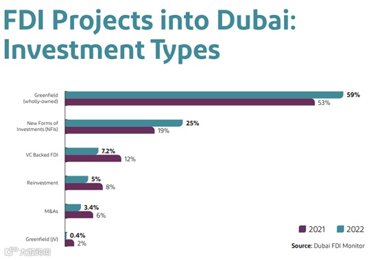 *流入项目包括,绿地FDI项目,再投资项目、并购&合资项目、新投资形式 (NFI) 和风投FDI项目,迪拜多样化的FDI项目结构,彰显了地区营商生态的活跃与开放。