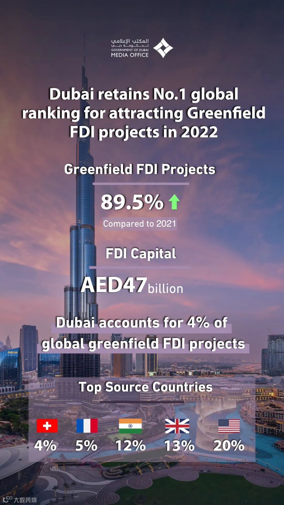 英国《Financial Times》 最新报道显示,2022年迪拜在吸引外商直接投资(FDI)中再创新高,成绩斐然。迪拜共吸引了1,173个FDI项目,并在绿地FDI项目中蝉联全球第一,超过伦敦、新加坡、纽约等重要经济城市。共计47亿迪拉姆的外商直接投资流入迪拜,在全球FDI资本流入目的地中排名第七,此次数据彰显了全球投资者对于长期投资迪拜的信心。
