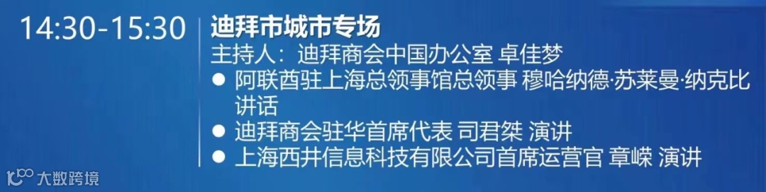 阿联酋驻上海总领事馆总领事穆哈纳德·苏莱曼·纳克比阁下、迪拜商会驻华首席代表司君桀、上海西井信息科技有限公司首席运营官章嵘受邀出席迪拜城市专场并发表致辞演讲,迪拜商会中国办公室卓佳梦主持。
