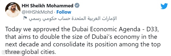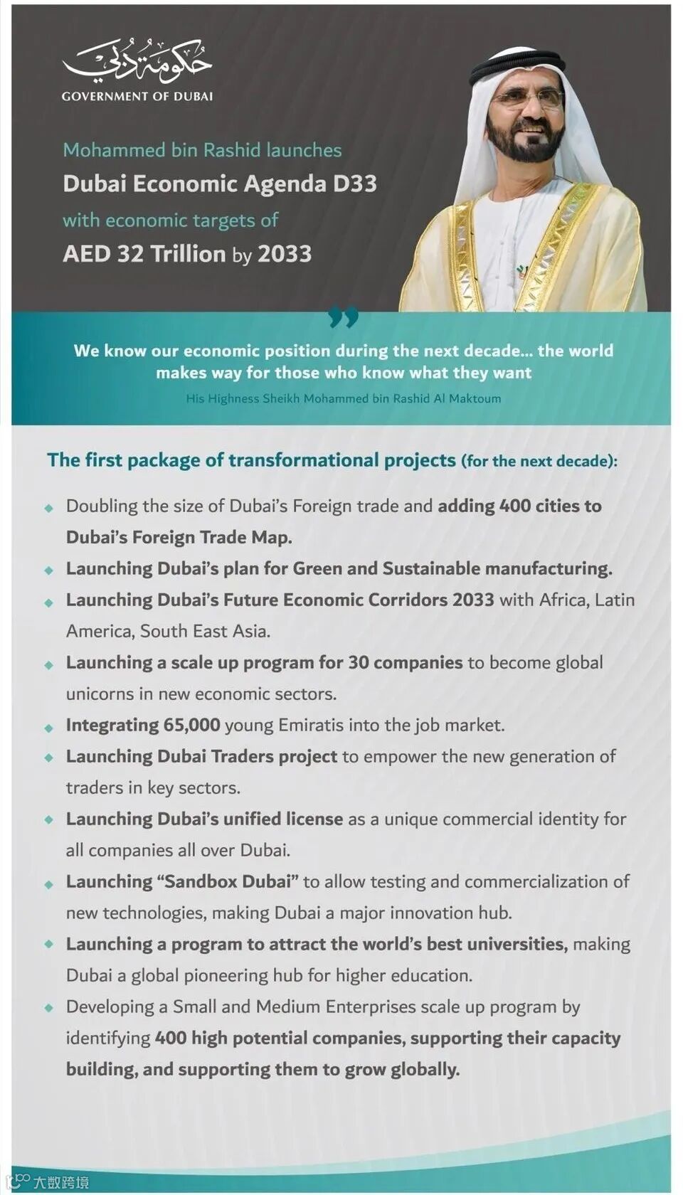 2023年1月4号,阿联酋副总统兼总理谢赫·穆罕默德·本·拉希德·阿勒马克图姆殿下宣布了一项总额为32万亿迪拉姆(折合人民币约59.84万亿)的经济发展计划——D33,旨在到2033年实现32万亿迪拉姆的经济目标,并使对外贸易和投资翻倍增长,将迪拜打造为世界前三的主要经济城市。