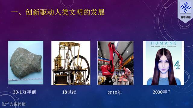 创新是推动社会发展的原动力,30-1万年前,人类使用的工具是石斧;18世纪,人类使用上了蒸汽机;现在工业机械手臂被广泛使用;未来几十年之内,也许智能型机器人会普及。在这些例子中,我们可以看到,人类创新的速度越来越快,时间间隔越来越小。我们处在这样一个时代,就要求我们要理解创新、抓住创新,才不会被这个时代淘汰。