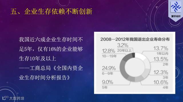 现在的社会,企业一直是在创新求生存中,而不是求发展。因为根据工商总局《全国内资企业生存时间分析报告》可以了解,我国近六成企业生存时间不足5年,仅有16%的企业能够生存10年及以上。所以生存才是首要目标。