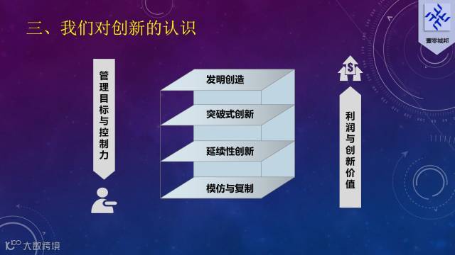 关于第四层——模仿与复制,可能很多人对此会有疑问,模仿与复制怎么是创新呢。其实我们中国的很多企业都是走的模仿与复制这条路,走访过程中很多管理者和我说,从技术上讲,这个不算创新,但确实我们的企业因此而实现降低成本,销售增长,所以我们把模仿与复制放到创新的第四个层次。在这四个层次中,从第四层到第一层,利润和创新价值是逐渐升高的,但管理者的管理能力和控制能力是逐渐下降的。