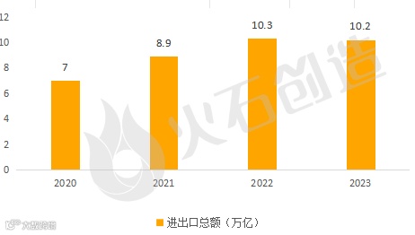 从进出口总额来,近4年来规模总体呈现增长趋势,从2020年的7万亿增长到2023年的10.2万亿元。近年来由于外部环境影响,进出口增长放缓。