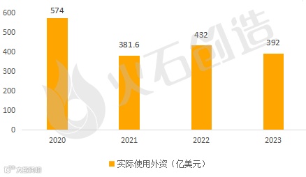 从实际使用外资情况来看,近4年国家级经开区吸引外资规模有所下降。2020年,217个国家级经开区实际使用外资和外商投资企业再投资574亿美元。2023年,229个国家级经开区实际使用外资392亿美元。