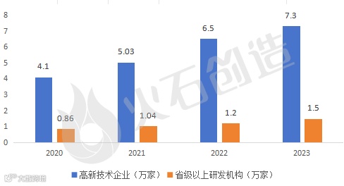 近4年来,国家级经开区科技创新能力增强。国家级孵化器和众创空间从2020年560家增长到2023年的707家,省级及以上研发机构翻了近一倍,从2020年的8600家增加到2023年的1.5万家。高新技术企业从4.1万家增长到7.3万家。