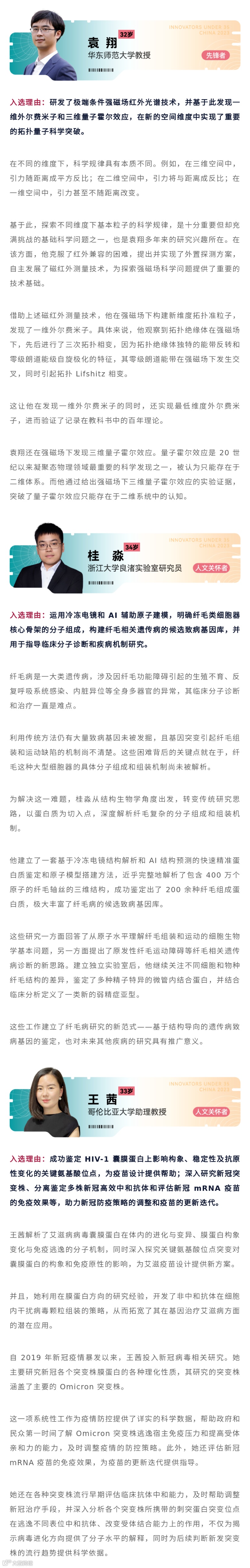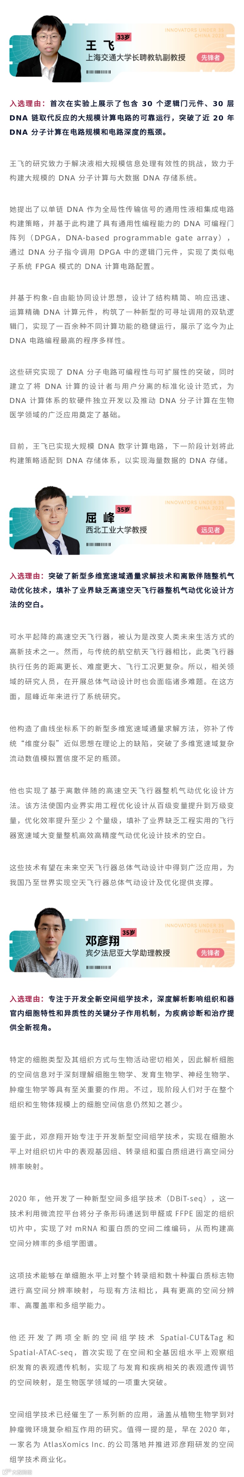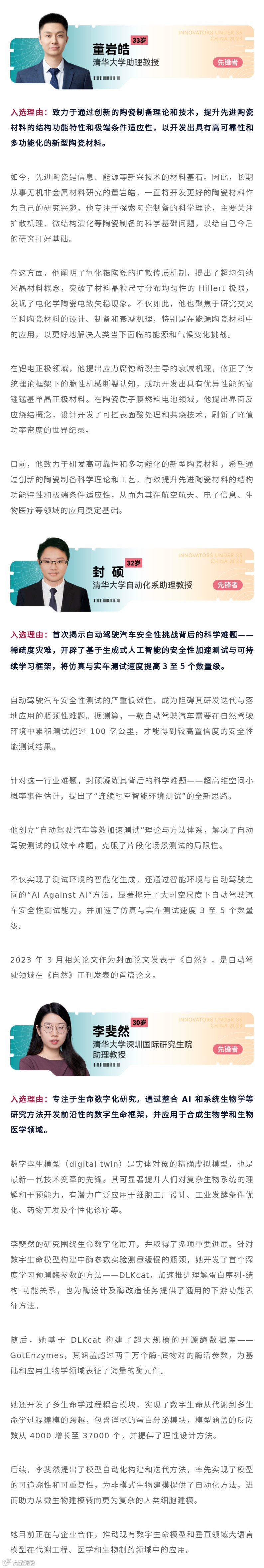 会上揭晓了2023年《麻省理工科技评论》“35岁以下科技创新35人”(TR35)中国入选名单,其中长三角地区共计12人,占比34.3%。一起来看入选名单(*以下排名不分先后):