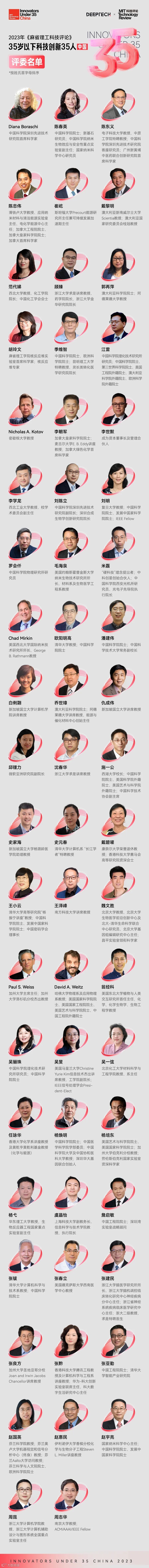 2023 年度《麻省理工科技评论》中国“35 岁以下科技创新 35 人”评选有幸获得近 60 位重量级专家评委的参与,他们是来自国内外各个专业领域的权威人士。在此,特别感谢以下评委的支持(按姓氏首字母排序):