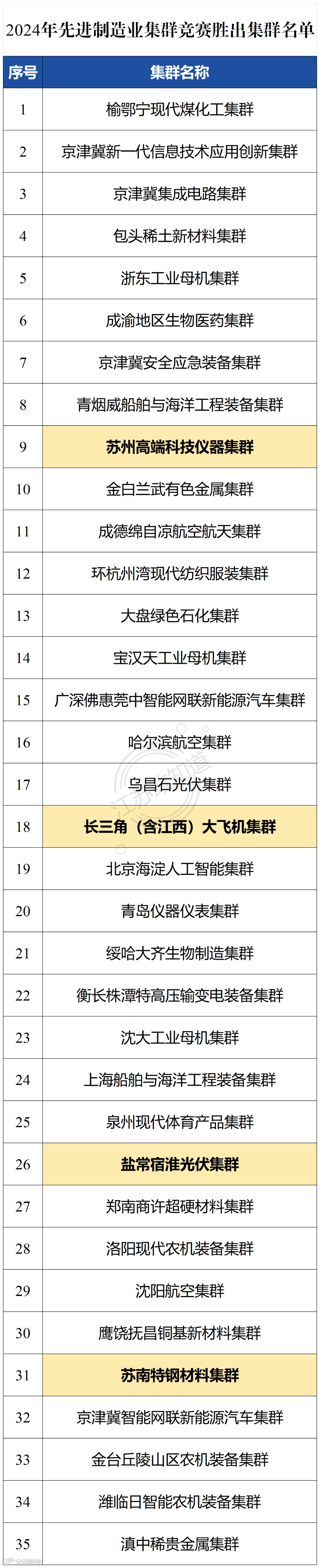 贯彻落实党中央、国务院关于加快培育壮大先进制造业集群的决策部署,工业和信息化部组织开展2024年先进制造业集群竞赛。按照《工业和信息化部办公厅关于组织开展2024年先进制造业集群竞赛的通知》(工信厅规函〔2024〕252号)要求,经小组赛和综合赛2轮专家评审,榆鄂宁现代煤化工集群等 35 个集群胜出。现将胜出集群名单予以公示。