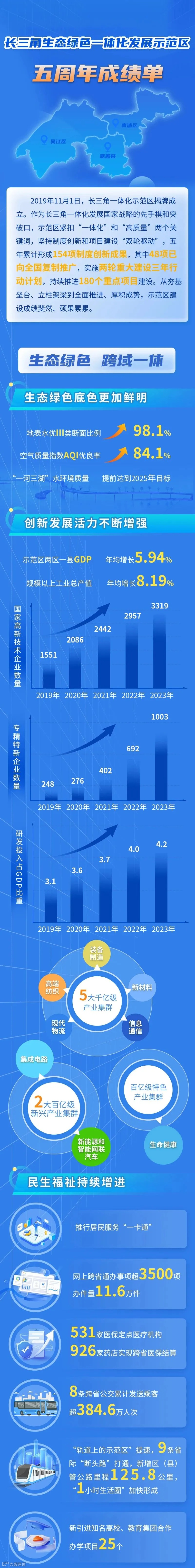 据介绍,经过五年建设,长三角一体化示范区生态底色更亮。成立至今,地表水优Ⅲ类断面比例从75%大幅提升到98.1%,“一河三湖”水环境质量已提前达到2025年规划目标;发展成色更足。2023年,两区一县GDP合计4725亿元,规模以上工业总产值达8729亿元,分别较2019年年均增长5.94%和8.19%。R&D经费投入强度增至4.2%,高于长三角三省一市平均水平,领先全国平均水平。国家高新技术企业3319家;民生福祉更优。“轨道上的示范区”建设提速。531家医保定点医疗机构、926家药店实现跨省医保结算。9条省际“断头路”陆续通车。8条跨省公交累计发送乘客超384.6万人次。网上跨省通办事项超3500项,累计办件量达11.6万件。