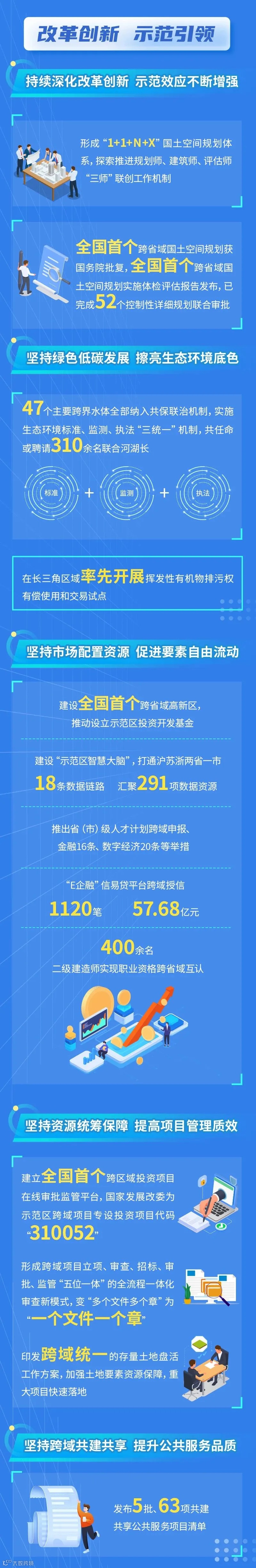 一是深化制度创新。聚焦重点领域,今年新推出了18项制度创新成果。强化规划引领,基本形成“1+1+N+X”国土空间规划体系,建立国土空间总体规划实施体检评估等机制,实现“一张蓝图管全域”。突出绿色发展,加强跨界水体联保共治,实施生态环境标准、监测、执法“三统一”等机制,构建生态保护制度“四梁八柱”。开展挥发性有机物排污权有偿使用和交易试点。坚持共建共享,先后发布5批63项共建共享公共服务项目清单,国家“大战略”给长三角一体化示范区群众带来了实实在在的“小幸福”。