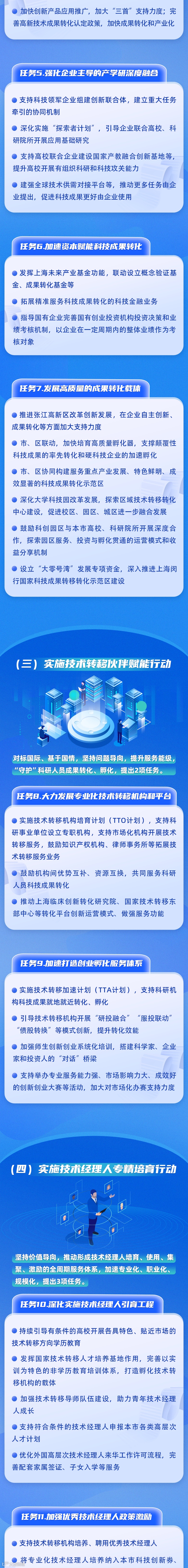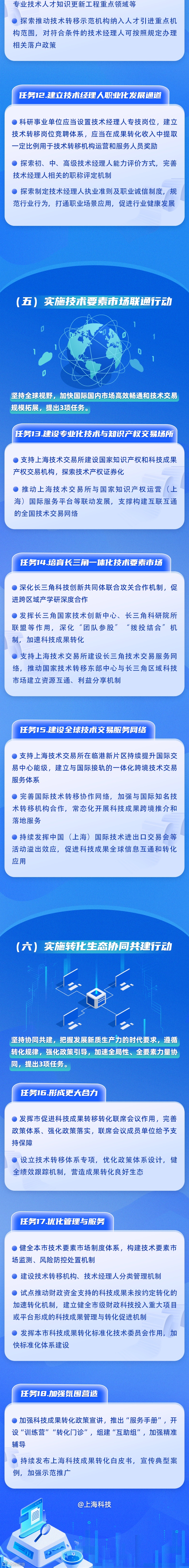 五是实施技术要素市场联通行动。针对本市在链接国际国内技术要素市场节点作用发挥不够、能级有待提升等问题,坚持全球视野,加快国际国内市场高效畅通和技术交易规模拓展,提出3项任务:建设专业化技术与知识产权交易场所、培育长三角一体化技术要素市场、建设全球技术交易服务网络。
