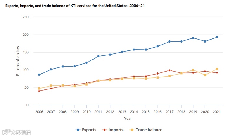 7. 2021年,美国KTI产业相关服务的出口额为1930亿美元,进口额为910亿美元,这些服务的贸易顺差为1020亿美元。