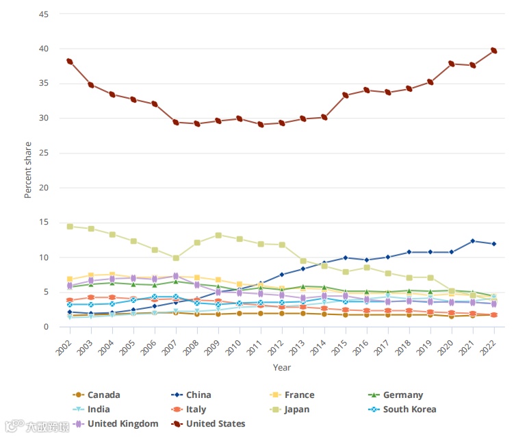 图2 选定经济体在全球KTI服务附加值中的所占份额(2002-2022年)