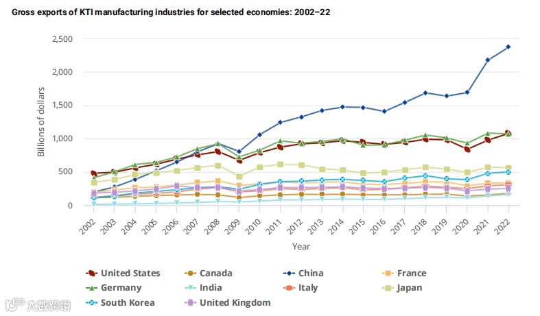 6. 按现值美元计算,2022年全球KTI制造业出口额为11.4万亿美元,比2021年增长6.6%,而2020年下降5.1%,2021年疫情后增长20.2%。自2008年以来,中国一直是主要的KTI制造业出口国。