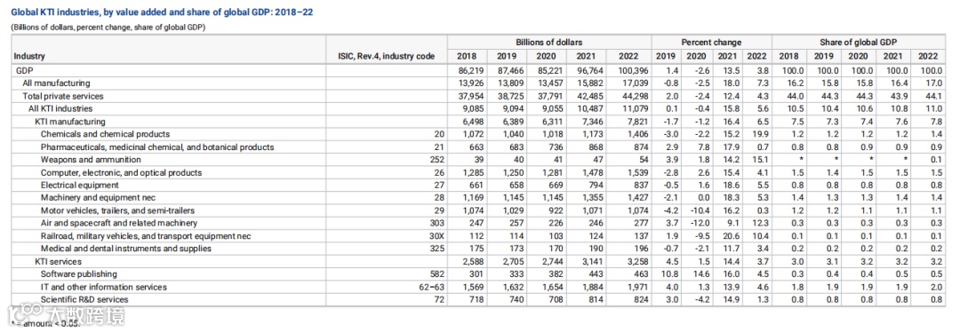 1. 2022年,KTI产业在全球范围内创造了11.1万亿美元附加值,按现值美元计算,比2021年增长了5.6%。按现值美元计算,从2020年到2021年,KTI产业在疫情后反弹了15.8%。