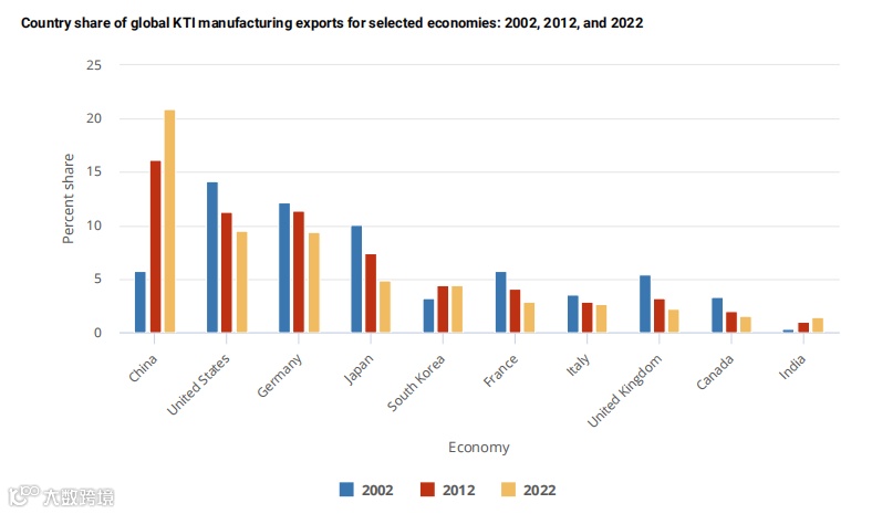 图4 选定经济体在全球KTI制造业出口中所占的份额(2002年、2012年和2022年)