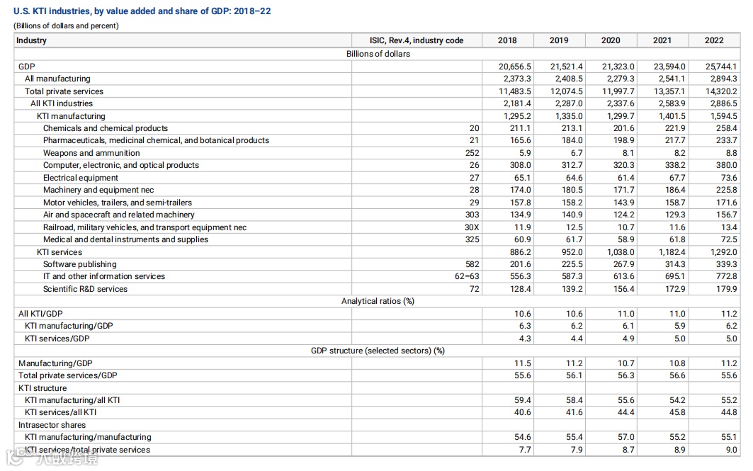 2. KTI产业约占美国国内生产总值(GDP)的十分之一。大多数KTI产业的产出属于制造业,而美国经济相对而言更偏重于服务业。