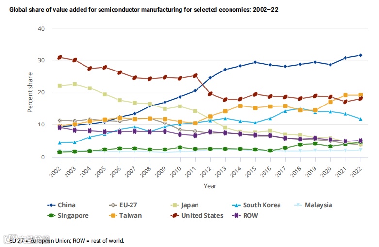 图3 选定经济体半导体制造业附加值的全球份额(2002-2022年)