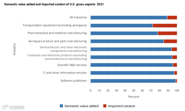 8. 全球供应链意味着,某一个国家的出口往往包括来自国内生产和进口投入的价值。就美国而言,在所有行业的出口总额中,国内所占份额远大于国外所占份额,自2007年以来一直在84%至90%之间波动。