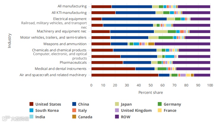 4. 2022年,美国在航空和航天器(57%)以及医疗和牙科器械(37%)这两个KTI制造业中的附加值所占全球份额最大,在制药以及武器和弹药制造业中与中国不相上下。中国在其他六个KTI制造业中占有最大份额:计算机、电子和光学产品(包括半导体);电气设备;铁路、军用车辆和其他未分类的运输设备(其他);机械和设备(其他);机动车辆、拖车和半拖车;化学品和化学产品(不包括药品)。