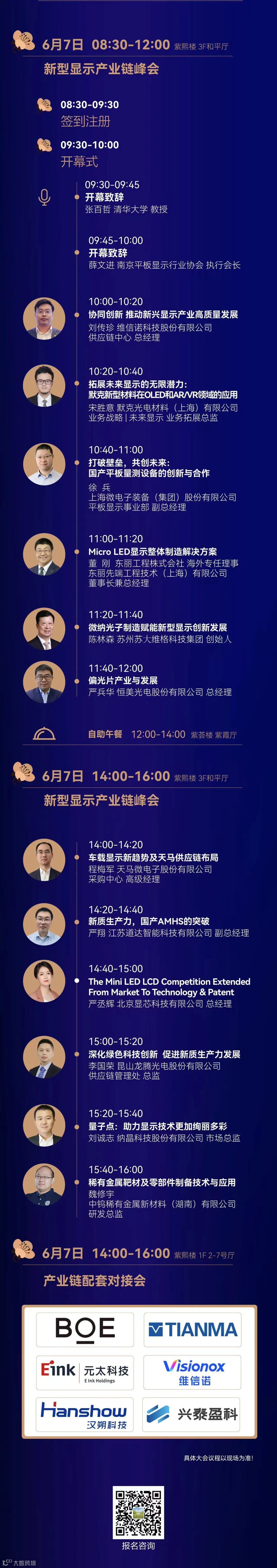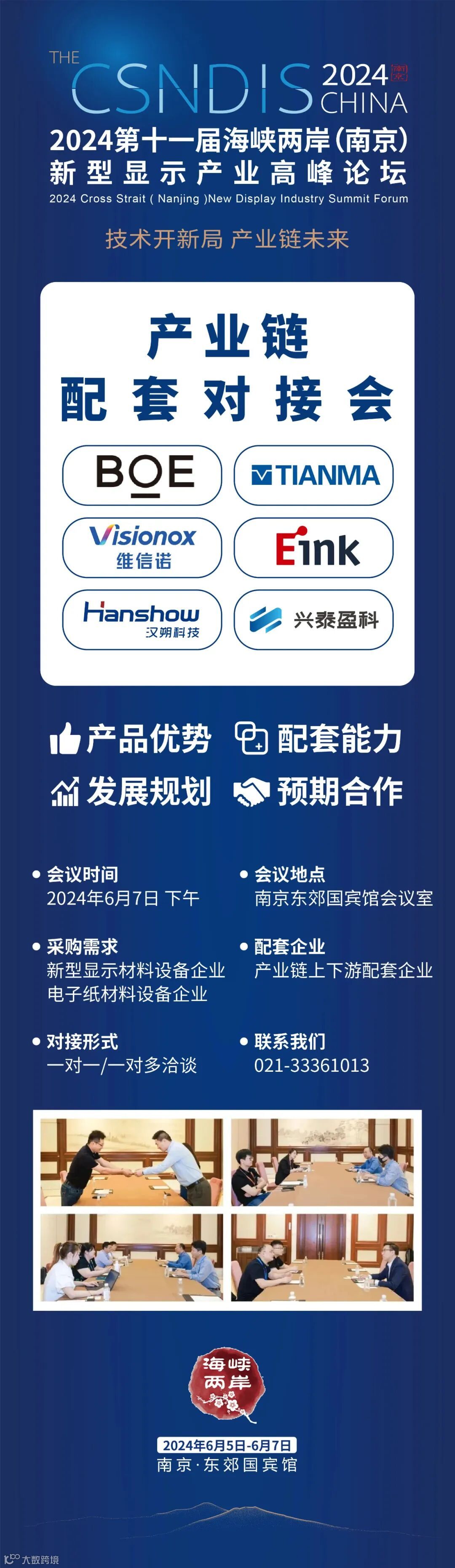 2024第十一届海峡两岸(南京)新型显示产业高峰论坛将在6月5日-7日在南京东郊国宾馆隆重召开,为帮助企业更好地对接供需资源,打造企业常态化的产业合作,今年大会将在现场举办多场产业配套对接会,特邀6家采购代表团——京东方、天马、维信诺、元太科技、兴泰科技、汉朔科技负责人莅临现场洽谈。主要面向新型显示材料设备企业、电子纸材料设备企业。旨在为企业搭建最接近供需的沟通平台。