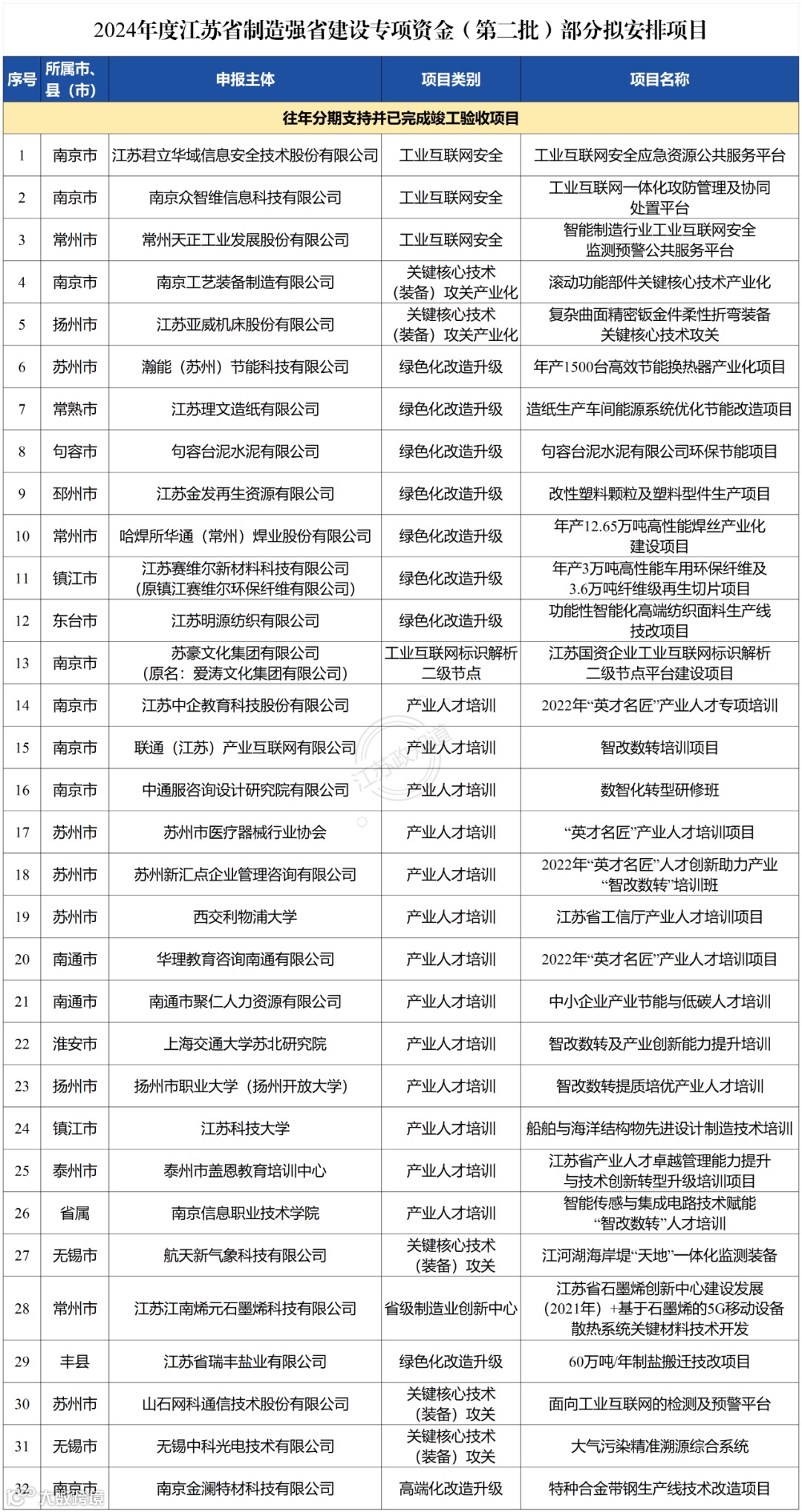 根据省工业和信息化厅、省财政厅《关于组织2024年度江苏省制造强省建设专项资金项目申报的通知》(苏工信综合〔2024〕102号),经规定程序,拟支持江苏君立华域信息安全技术股份有限公司“工业互联网安全应急资源公共服务平台”等 32 个项目,现予公示。