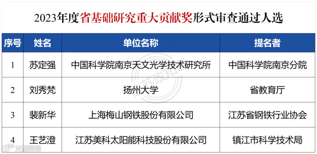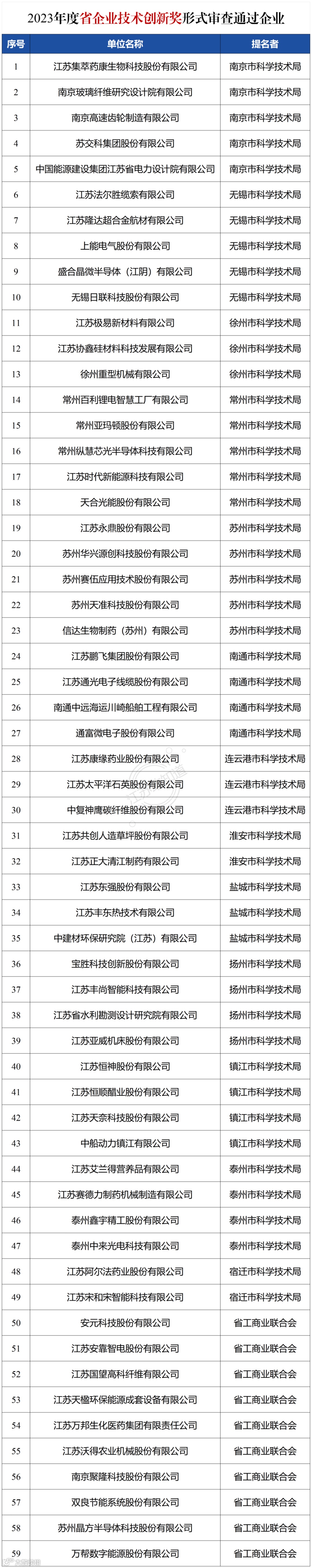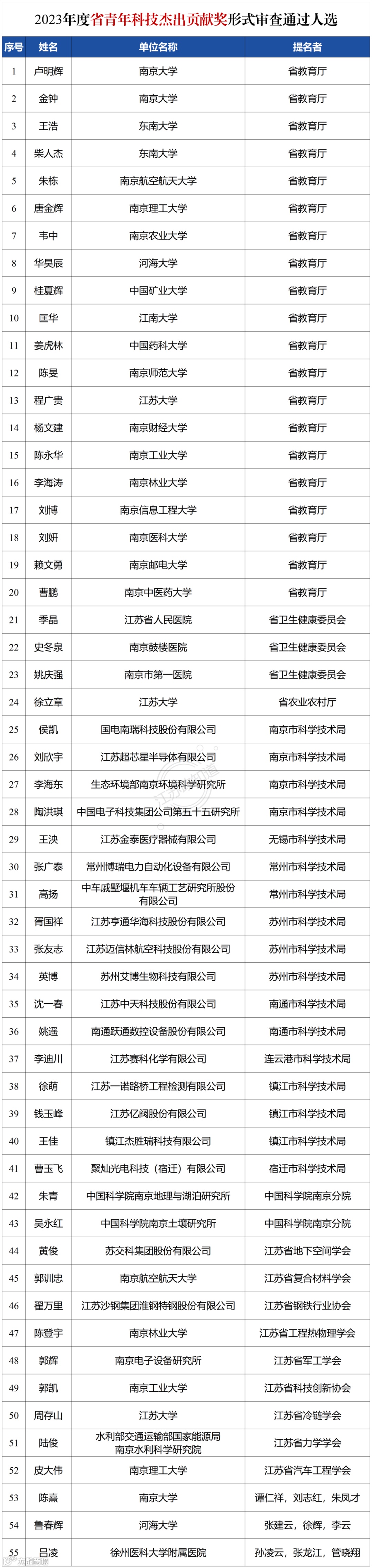 2023年度江苏省科学技术奖提名工作已经结束,共受理各单位和专家提名省科学技术奖通用项目 1158 项,省基础研究重大贡献奖人选 4 名,省青年科技杰出贡献奖人选 55 名,省企业技术创新奖企业 59 家。根据《江苏省科学技术奖励办法》和《江苏省人民政府关于修改〈江苏省科学技术奖励办法〉的决定》的规定,2023年度省科学技术奖拟授奖总数不超过300项(含专用项目)。本年度评审工作实行三轮评审的逐级淘汰制,网络评审具体成绩和排序不带入专业答辩评审,专业答辩评审具体成绩和排序不带入综合评审。现将形式审查通过的 1145 项省科学技术奖被提名通用项目、 4 名省基础研究重大贡献奖被提名人选、 55 名省青年科技杰出贡献奖被提名人选、 59 家省企业技术创新奖被提名企业及其提名者进行公示。