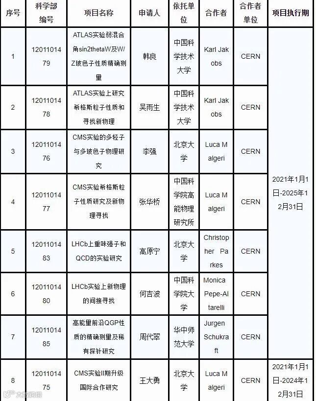 3、根据国家自然科学基金委员会(NSFC)与欧洲核子研究中心(CERN)签署的合作谅解备忘录,2020年度继续支持中国科学家参与CERN的国际合作。以下8个项目获得批准。