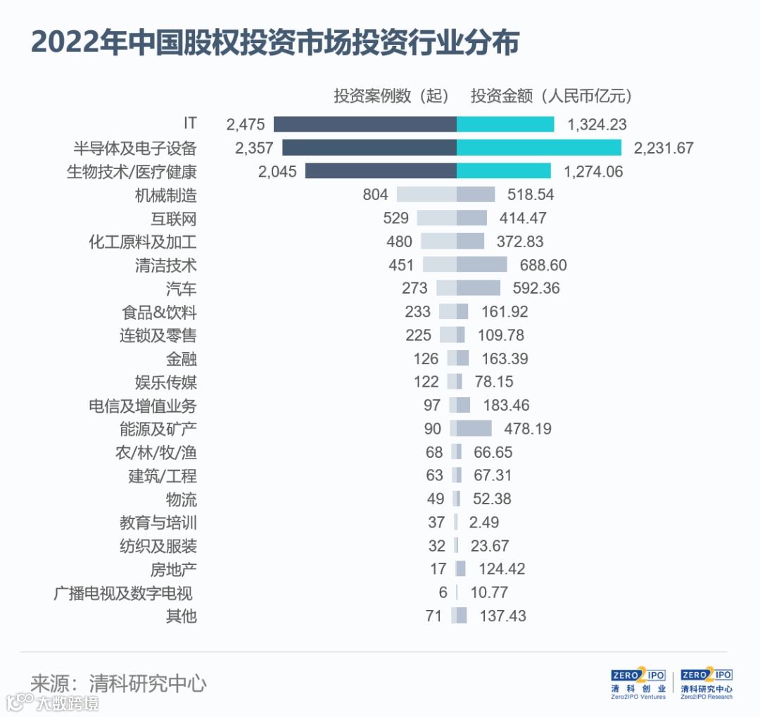 2022年投资市场热度集中于科创行业,IT、半导体及电子设备、生物技术/医疗健康和机械制造四大产业共发生投资事件7,681起,占市场总投资案例数的72.1%,较2021年上升5.6个百分点。其中,IT行业(2,475起,-21.8%;1,324.23亿元,-41.5%)投资案例数领跑市场,数字化发展推动创新应用加速涌现,大数据、人工智能、云计算等细分赛道持续受到投资机构关注;半导体及电子设备行业(2,357起,27.5%;2,231.67亿元,-10.4%)吸纳了大量资金,投资规模及案例数分别位列第1及第2,这主要得益于国产替代与自主研发加速、行业政策红利及产品多元化应用;生物技术/医疗健康行业(2,045起,-18.8%;1,274.06亿元,-49.0%)热度延续,案例数及金额均位列第3,创新药研发、创新医疗器械等持续释放潜能;机械制造行业(804起,20.5%;518.54亿元,-16.6%)转型升级加速,案例数超越互联网位列第4位,工业机器人、商业航天等子赛道方兴未艾。