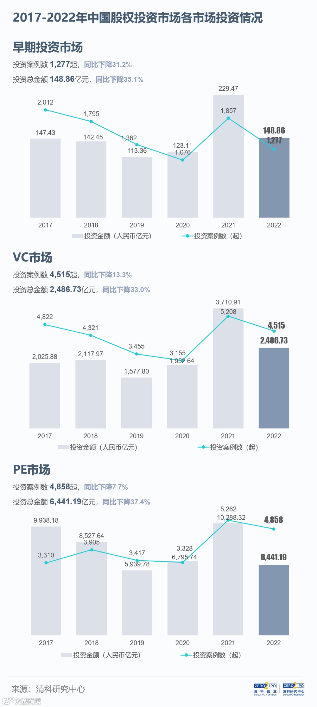 2、“案例数(按市场)”指同一投资机构类型对一家企业的同一轮投资统计为1起投资案例,除非特别提示,本报告投资案例数均按照此维度统计;“案例数(按企业)”未区分投资机构类型,即一家企业的同一轮融资统计为1起投资案例。