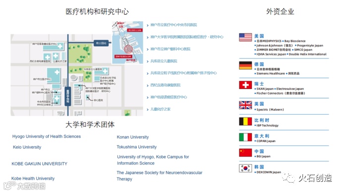 KBIC以医疗带动产业发展。神户市立医疗中心中央市民医院、神户大学医学院附属医院国际癌症医疗研究中心、兵库县立儿童医院等数十家医疗机构活跃在创新疗法前沿,为医药企业的研发创新提供最新应用场景。同时,数十家大学和学术团体在此聚集,为产业集群的发展提供基础研究和人力资源。密集的产业要素吸引跨国企业入驻,强生、拜耳、勃林格殷翰等一批跨国企业在此设立分部。