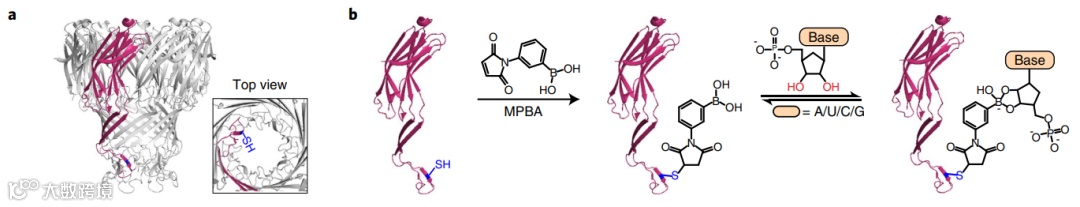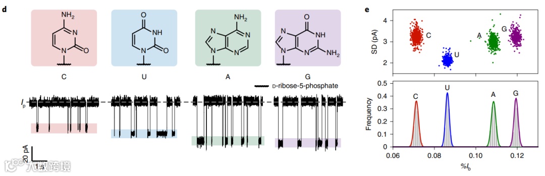 该研究团队通过原核共表达体系,在八聚体中成功引入了一条含半胱氨酸突变的单体,实现了异质 MspA 纳米孔的构建。随后通过马来酰亚胺苯硼酸与巯基的迈克尔加成反应,进一步在孔道内引入了唯一的苯硼酸适配体。利用苯硼酸和核苷酸上顺式二醇的可逆相互作用,研究团队实现了对四种经典核苷酸(C、U、A、G)的完全区分,其效果远优于现有的报道,充分证明了异质 MspA 孔道检测核苷酸的可行性及高分辨率。