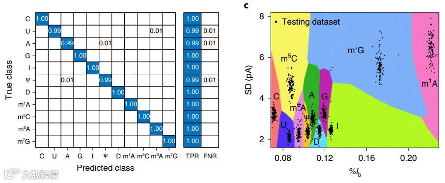 随后,研究团队针对 RNA 表观遗传学修饰信号数据库开发了机器学习算法辅助纳米孔事件的自动识别。通过选取每种核苷酸500个标准事件作为训练集和对各种机器学习模型的评估,研究团队获得最优的线性 SVM 模型。该模型对十一种核苷酸区分的准确率达到99.6%,并且对混合的核苷酸样品可以进行成分鉴定,为真实环境下核苷酸的检测提供了自动化数据分析工具。