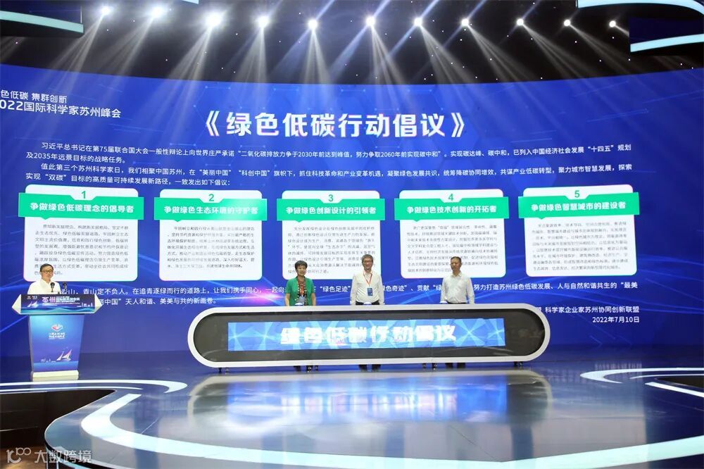 7月10日下午,2022年(第十四届)苏州国际精英创业周暨第三届苏州科学家日重要活动之一的2022国际科学家苏州峰会在苏州广播电视总台2000平米演播厅举行,会上由世界绿色设计组织、江苏省海外人才创新创业联盟、科学家企业家苏州协同创新联盟三家组织共同签署发出了《绿色低碳行动倡议》,倡议提出:抓住科技革命和产业变革机遇,凝聚绿色发展共识,统筹降碳协同增效,共谋产业低碳转型,聚力城市智慧发展,探索实现“双碳”目标的高质量可持续发展新路径,争做绿色低碳理念的倡导者、争做绿色生态环境的守护者、争做绿色创新设计的引领者、争做绿色技术创新的开拓者、争做绿色智慧城市的建设者。